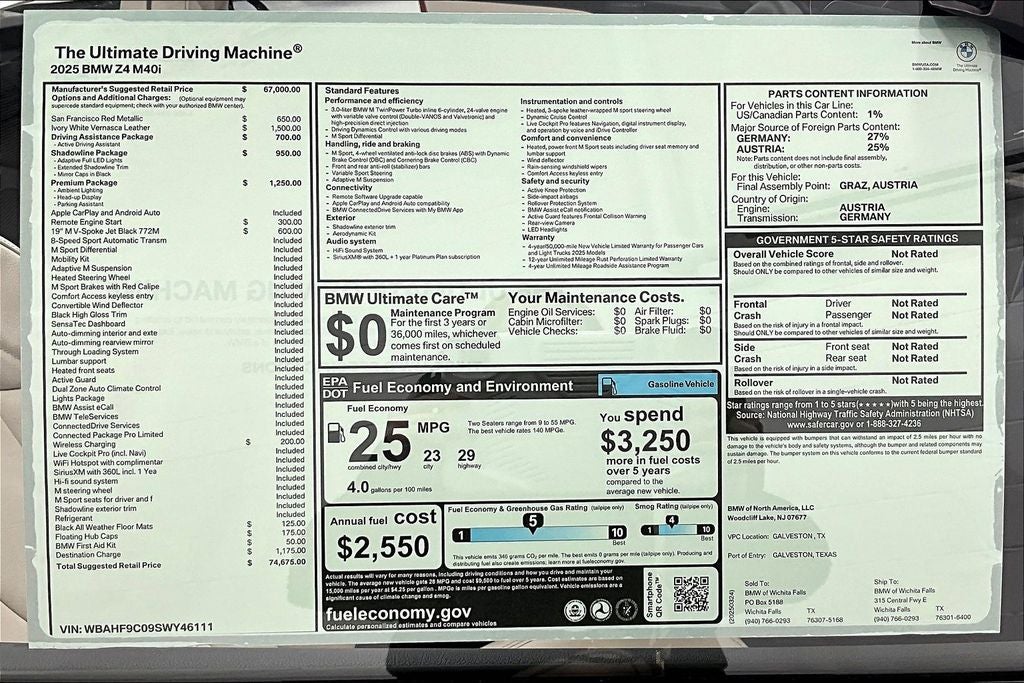 This 2025 BMW Z4 sDrive30i is a true driver's car, offering a captivating blend of style, performance, and technology. With only 7 miles on the odometer, this nearly new vehicle is a rare find. Experience the thrill of open-air driving and the uncompromising quality of a BMW. Schedule a test drive today and discover the joy of owning this exceptional sports car.
